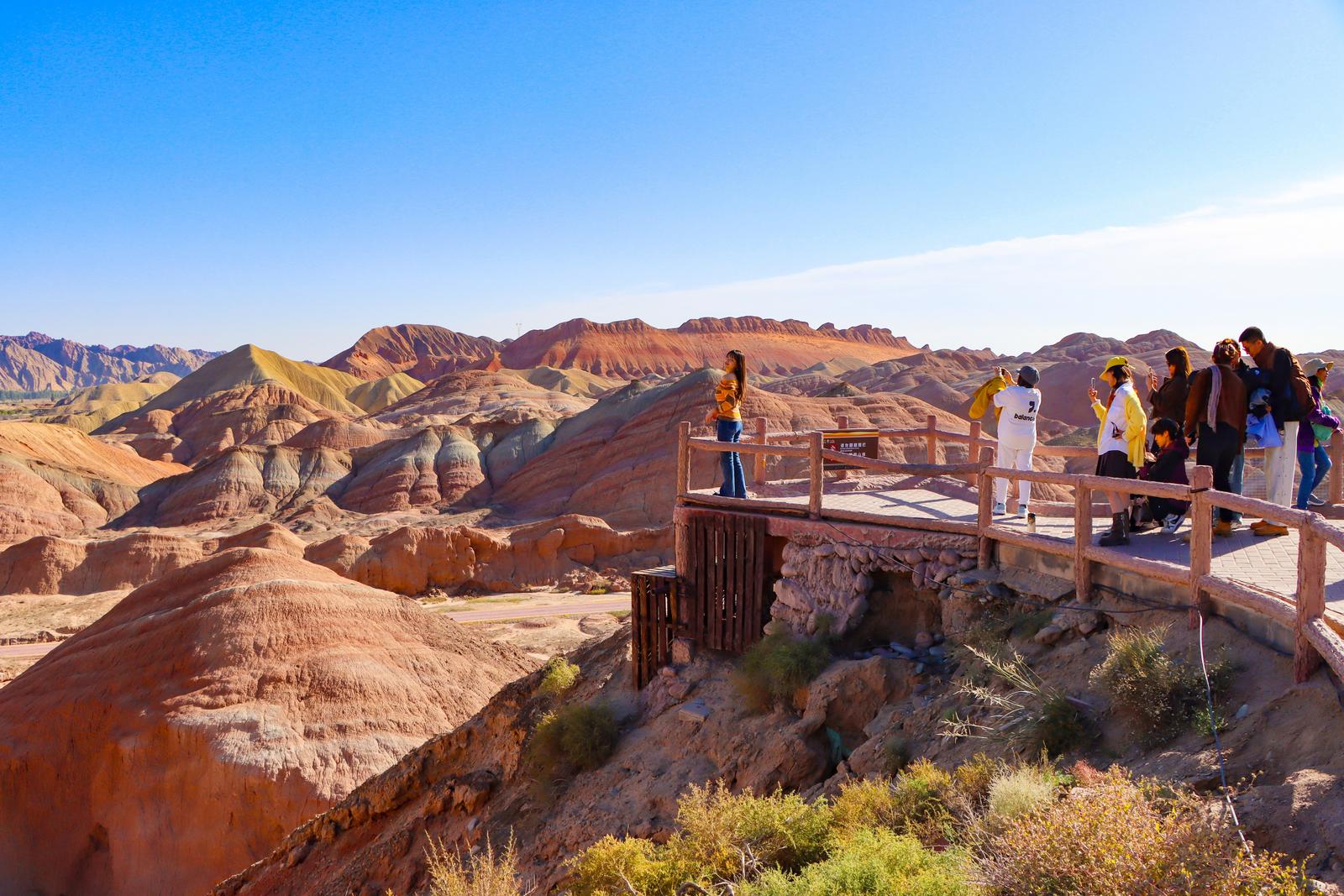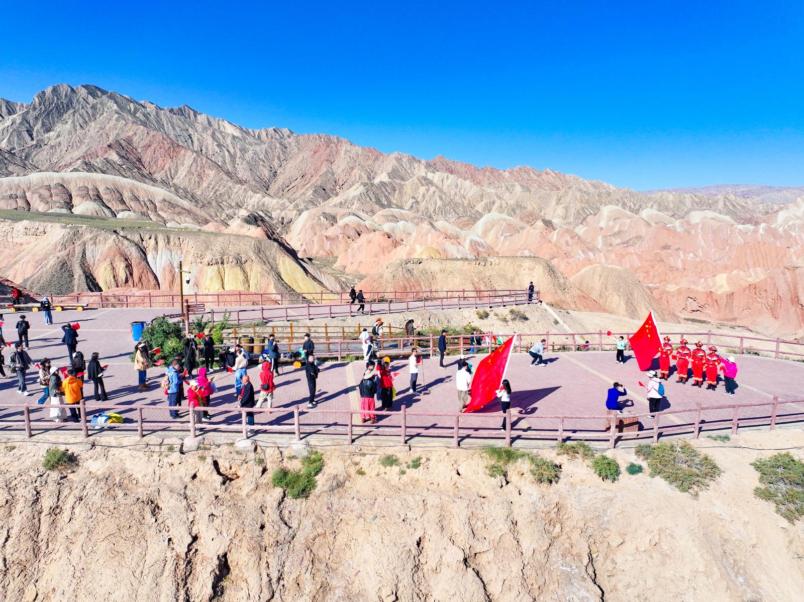 地质纹理与瞬时光影的交织,呈现丹霞作为自然艺术品的多维美感,斑驳陆离的山体雕琢成奇特景观,让游客惊叹这鬼斧神工的大自然之作。正午的烈日下,七彩丹霞山如同燃烧的火焰;雨后初晴时,湿润的岩壁又化作多彩玛瑙盘,水珠在七彩沟壑间折射出耀眼的光芒。当落日斜切过山脊,每道棱角都变得斑斓,像无数把竖琴被晚风拨响,奏响壮丽彩章。“这个地质特别丰富,色彩特别鲜艳,身临其境之后感觉很开阔,确实不虚此行。回去后我会介绍其他朋友来张掖旅游,亲身体验七彩丹霞的魅力。今天是祖国的生日,我们在美丽的七彩丹霞祝福祖国繁荣昌盛。”江苏的赵先生相约西安的朋友一起结伴出游。
