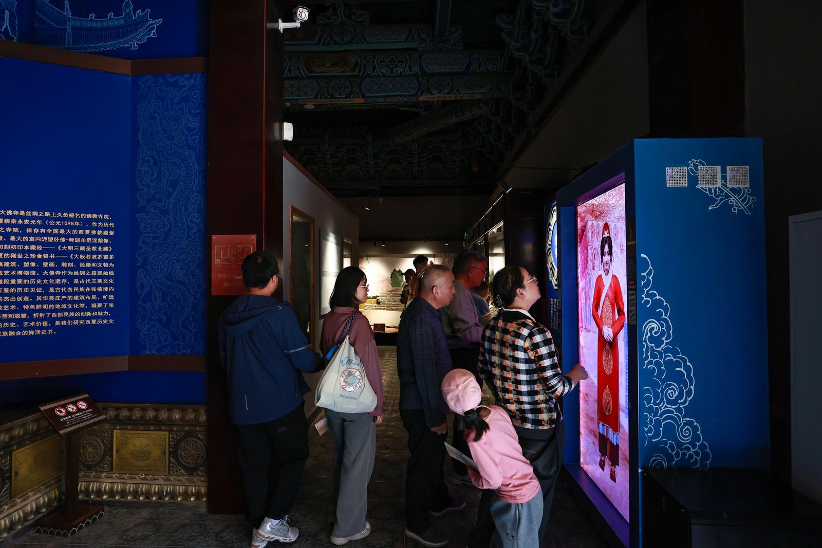 “为了做好国庆、中秋双节游客接待工作,我们从多个方面发力,对景区安全设施进行再检查,并加强工作人员服务培训,同时上线自助售票机,开放‘云灼公主’数字化体验项目,增加引导指示牌,在售票处、检票口、咨询点增设志愿岗,随时为游客提供免费咨询、行李寄存、讲解办理、道路指引等服务。”张掖大佛寺文物研究所副所长陈瑛表示,国庆、中秋假期,大佛寺还开展“云灼公主”特色讲解、汉服免费参观、书写西夏文字、演绎西夏舞蹈、体验雕版印刷等丰富多彩的活动,让游客在参观的同时参与体验活动,了解西夏文化、西夏文字、雕版印刷等,感受大佛寺景区的独特魅力。