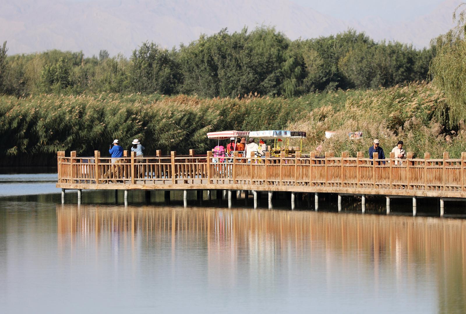 张掖国家湿地公园内,清澈的湖水倒映着蓝天白云,葱郁的树木点缀其间,成群的天鹅悠然游弋,吸引了大量游客驻足观赏。作为丝绸之路上的“绿色明珠”,这片国家级湿地不仅是张掖生态保护的标志性成果,更成为双节期间市民休闲度假的热门选择。景区推出的自行车骑行、观光车游览等多种游乐项目,进一步丰富了游客体验,让人们在亲近自然中感受假日的惬意。