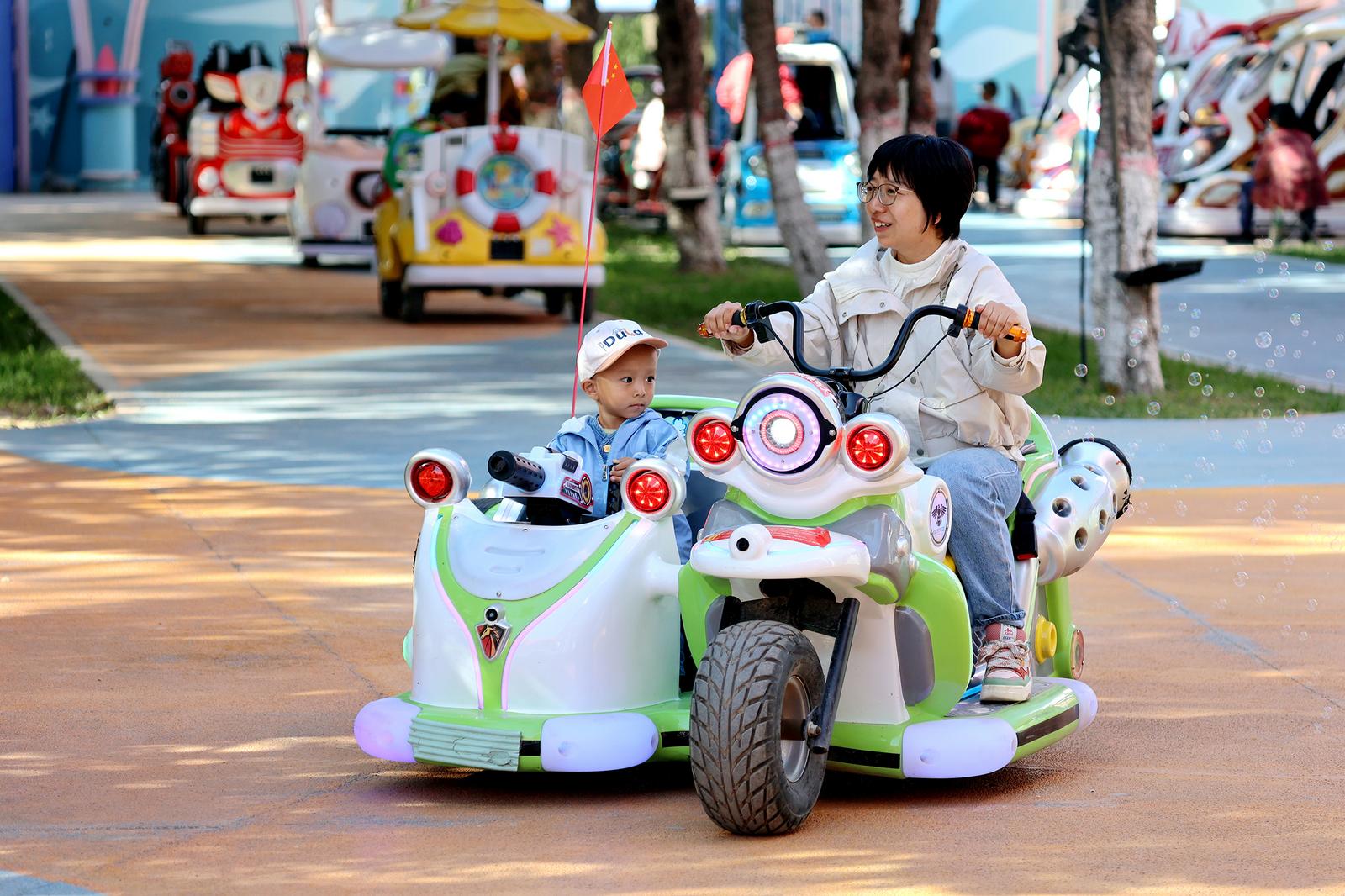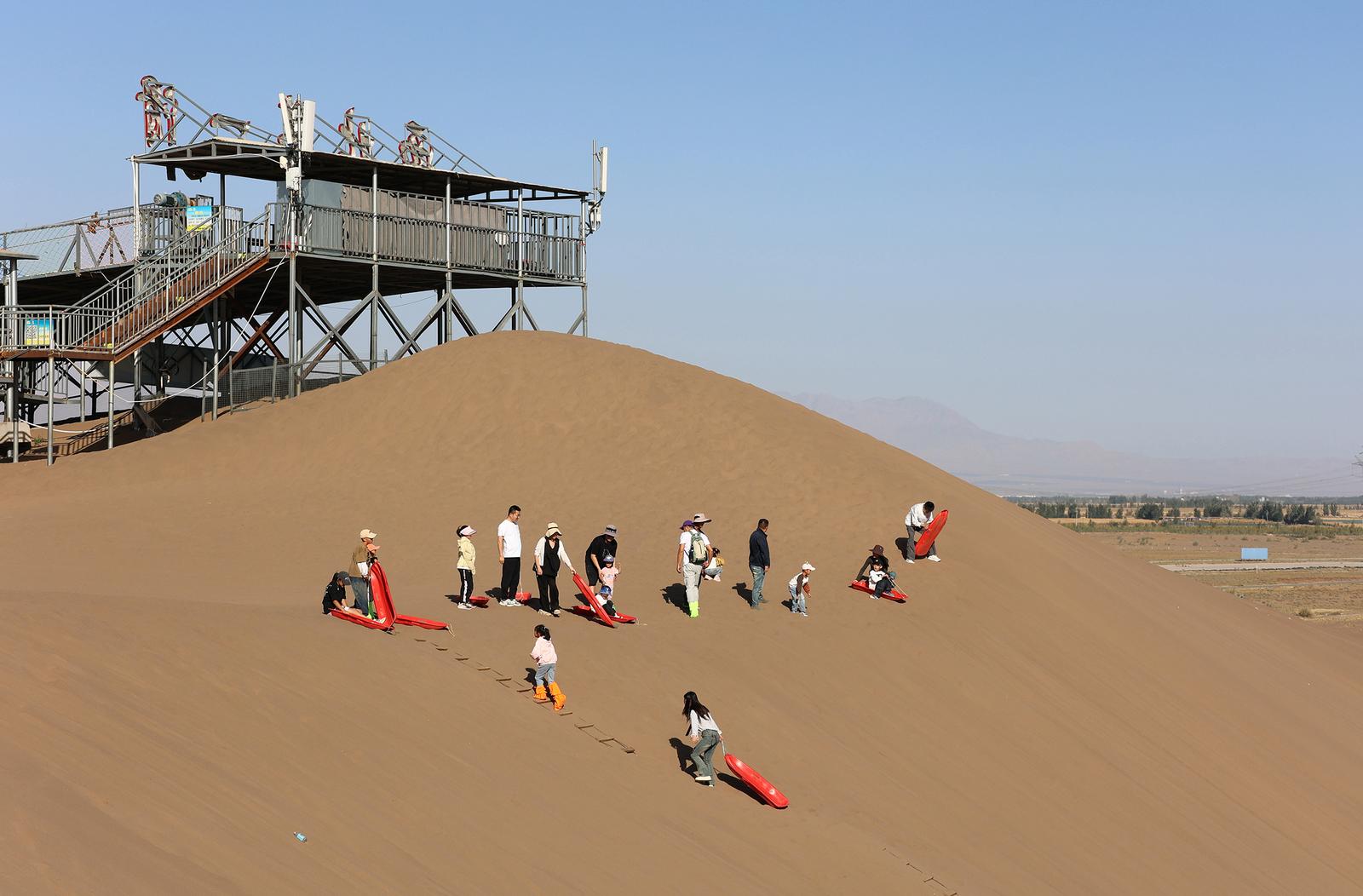 从杭州前来游玩的游客徐铭谣分享道:“来张掖四五天了,今天到沙漠公园,滑沙、滑梯、水道这些项目特别有意思,孩子玩得特别开心。相比之前游览过的雄奇地貌,沙漠公园的互动性项目更能调动孩子的参与热情。”