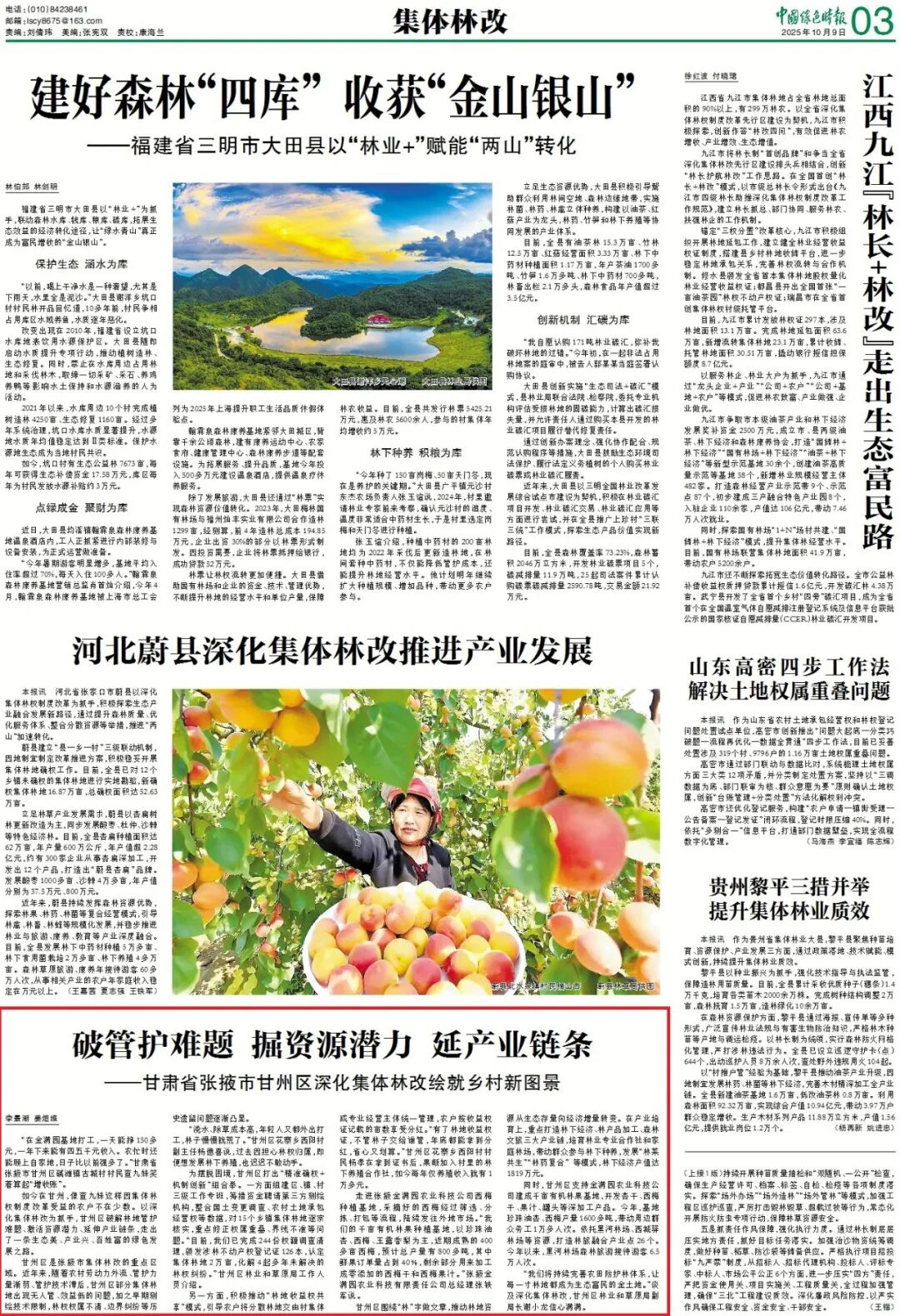 10月9日,《中国绿色时报》第三版以《破管护难题 掘资源潜力 延产业链条》为题,报道了甘肃省张掖市甘州区深化集体林改绘就乡村新图景,走出了一条生态美、产业兴、百姓富的绿色发展之路。