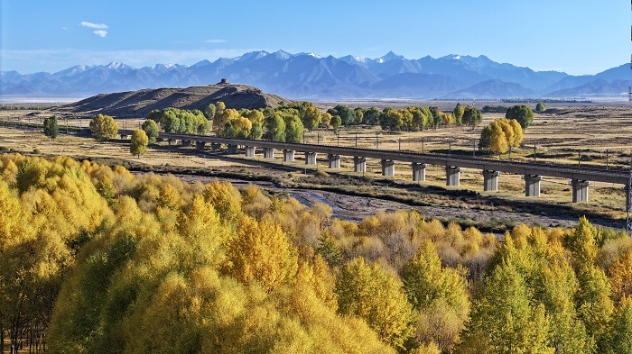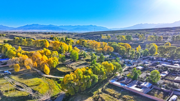 近日,张掖市民乐县永固镇姚寨村秋意盎然。在夕阳的照射下,远山、村庄、道路与层林尽染的森林相互交织,勾勒出一幅如诗如画的秋日盛景,吸引众多游客前来观赏、打卡。(王晓泾 杨晓丽)