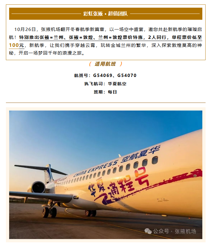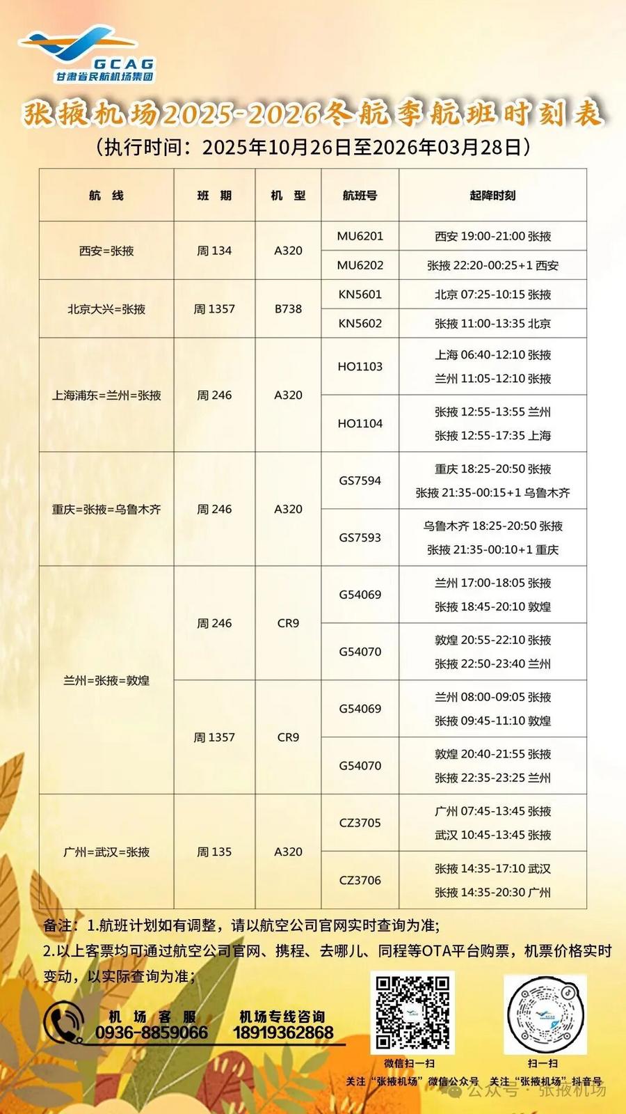 张掖机场 | 10月26日起执行冬春航季航班计划!(附新航季航班时刻表)