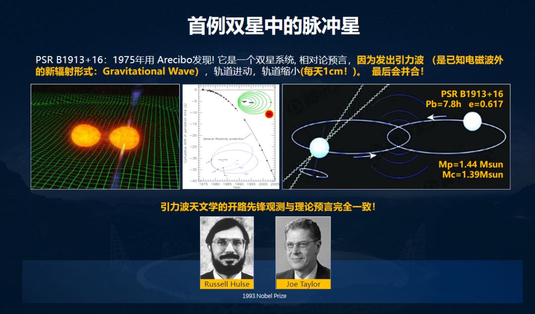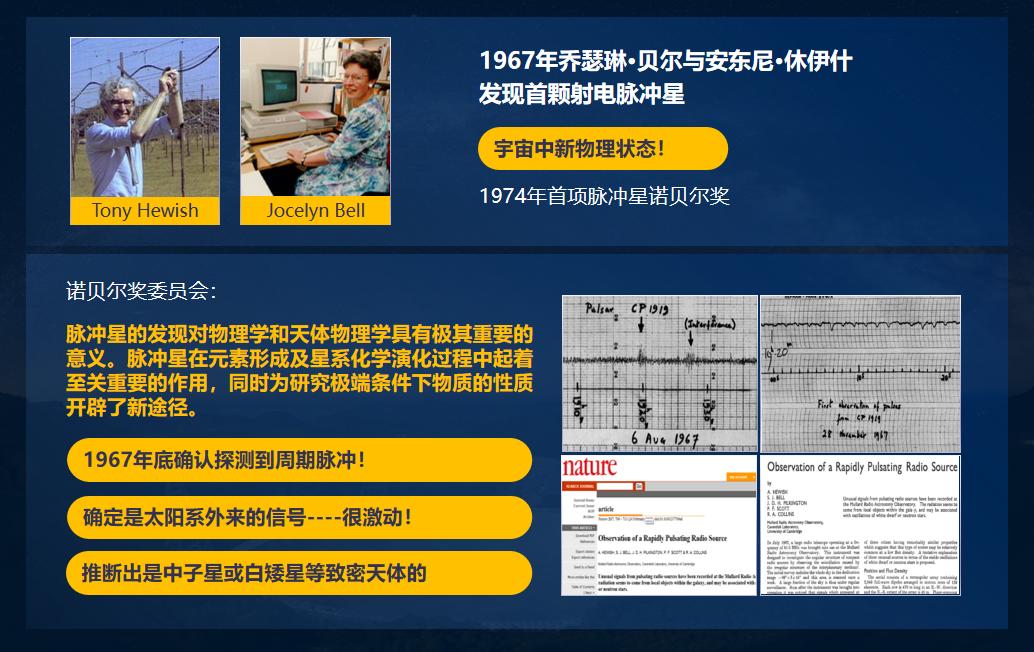 1967-1968年,英国Hewish教授及其学生通过无线电波阵发现了脉冲信号。这个波动跟地球上汽车开过去的干扰信号非常相似,但是Hewish教授的学生通过仔细观察,发现了其中的细微区别,后来,他们发现这个信号会每天提前4 分钟到达——这是来自天上的信号和来自地球的信号的区别,最终确认它来自中子星,就是现在大家说的脉冲星。Hewish教授也因此获得诺贝尔奖。