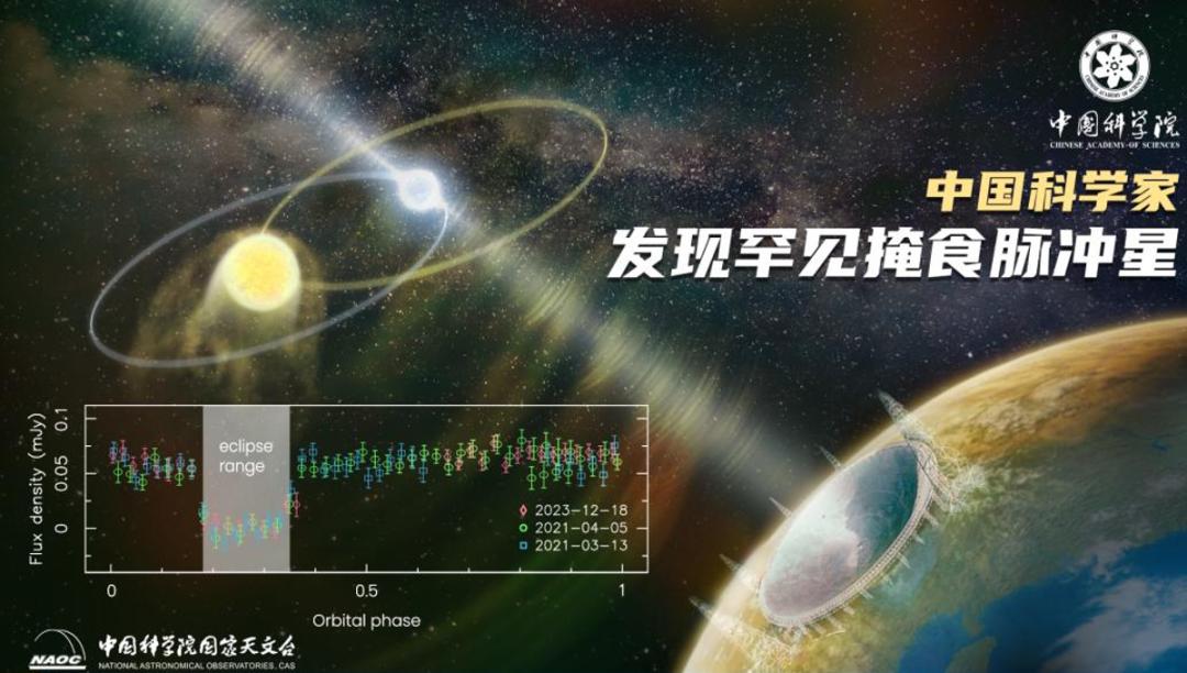 科研人员还发现了特殊的双星系统。比如下图的这颗脉冲星,它是一个中子星与一个氦星组成的双星系统。当氦星运行至脉冲星与地球之间时,会遮挡脉冲星信号,即掩食现象。