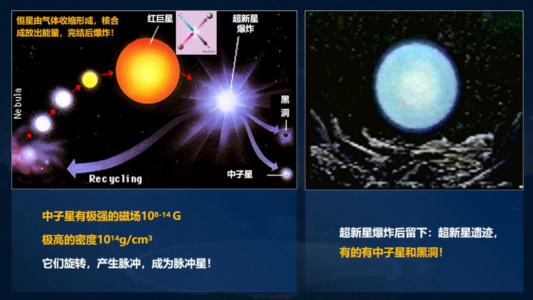 中子星是一种特殊天体,密度极高、磁场极强,旋转时会产生脉冲。银河系内因此存在大量恒星死亡后经超新星爆炸形成的中子星。