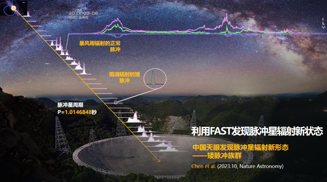 除了发现新脉冲星,FAST在脉冲星辐射难题的研究中也做出了重要贡献。过去认为部分脉冲星会“停止辐射脉冲”,但FAST观测发现,这些“停止辐射”的阶段仍存在极微弱的“矮脉冲”,这类矮脉冲,时间很短、强度很低,一般的望远镜很难观测得很清楚。 FAST已发现多个脉冲星有类似的辐射,为已经脉冲星辐射的物理过程提供了重要基础。