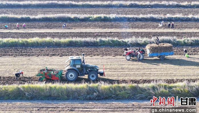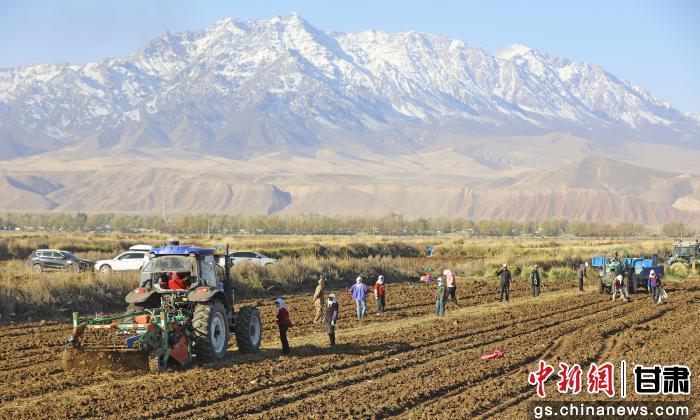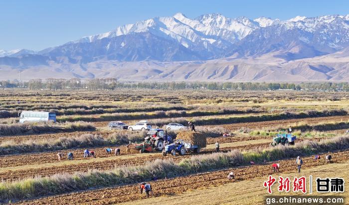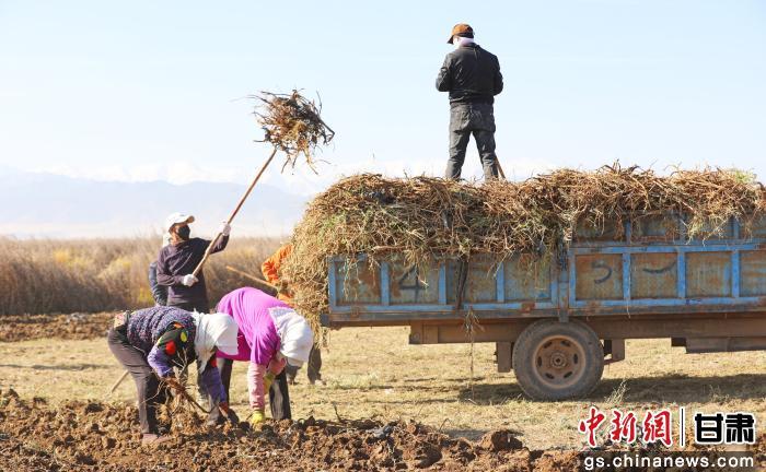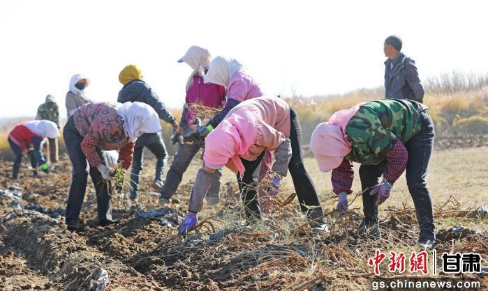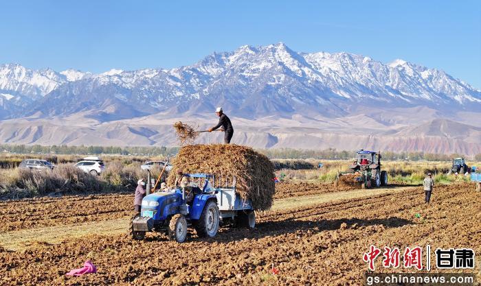 近日,在张掖市民乐县永固镇滕庄村千亩黄芪种植基地,药农忙着采收中药材黄芪,田间地头一派繁忙景象。
