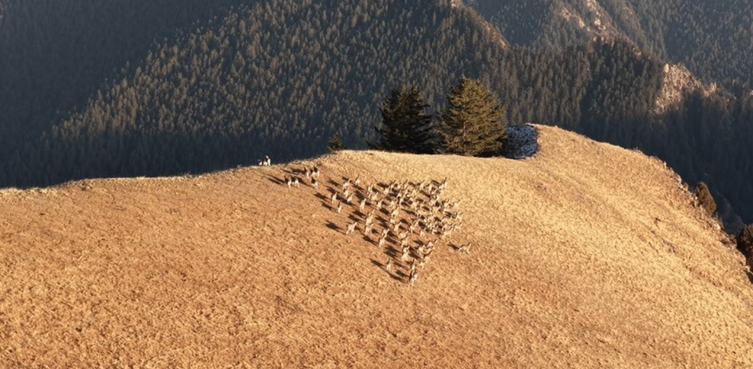 据拍摄者介绍,当日下午五点多,在山丹马场草原发现远处缓坡地带出现大面积移动的兽群。通过长焦镜头观察确认,这群兽群由马鹿、狍鹿等鹿科动物和岩羊组成,数量远超往常所见。