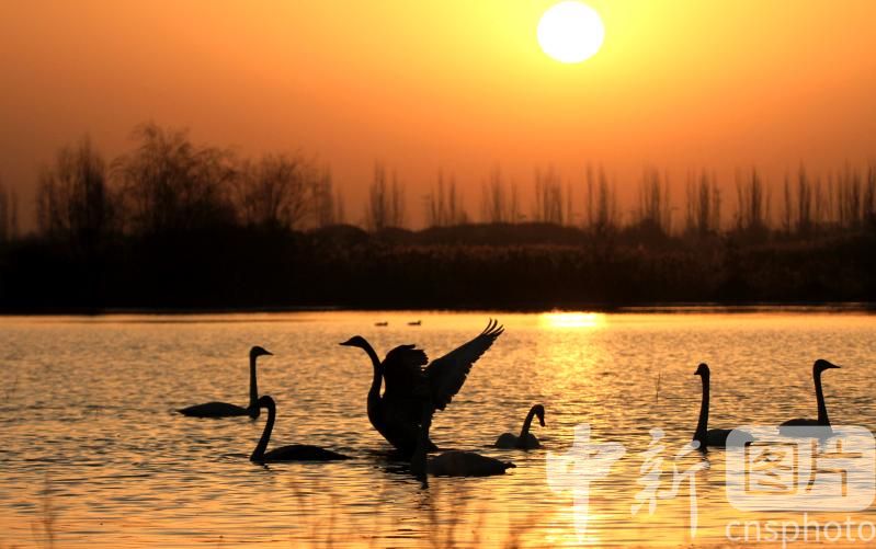 一群大天鹅在红日映照下的甘肃省张掖市国家湿地公园湖水中悠闲栖息。冬日清晨,初升的红日映照在张掖市国家湿地公园,将湖水渲染成一片红色,成群的大天鹅在宽阔的湖水中或悠闲栖息觅食,或展翅飞翔,沉寂的湿地公园呈现出一片暖意融融的欢腾景象。