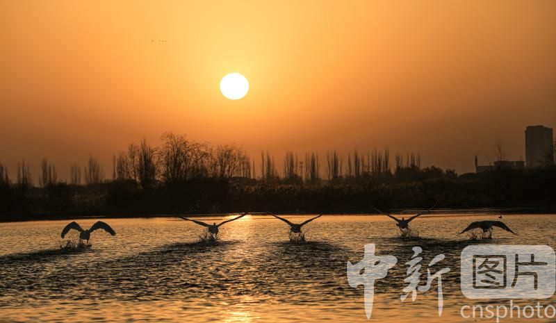 一群大天鹅在红日映照下的甘肃省张掖市国家湿地公园湖水中欢腾起飞。
