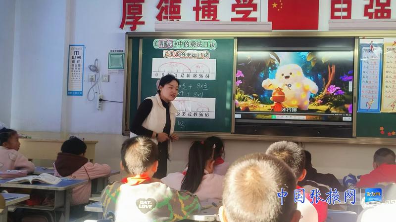 活动中,甘泉街小学曹老师带来《有多少张贴画》展示课,通过趣味情境导入,引导学生动手摆学具、小组合作计数、自主编口诀,探索6的乘法口诀推导过程。新墩镇中心学校白老师以《西游记》故事为主线,创设“师徒取经闯关”情境,将乘法口诀融入“悟空摘蟠桃”等经典桥段,搭配“口诀接龙”“闯关赢通关文牒”等互动游戏,让学生在沉浸式体验中巩固知识,课堂氛围热烈高效。