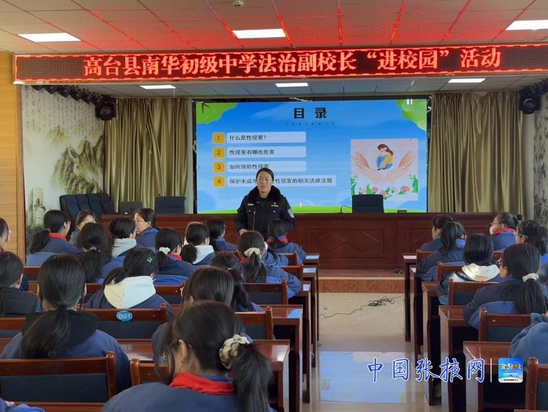 中国张掖网高台讯 为切实增强未成年人的自我保护意识,筑牢校园安全防线,近日,高台县南华初级中学联合南华司法所,为学校四至九年级女学生带来了一场“预防性侵害”的法治教育专题讲座。