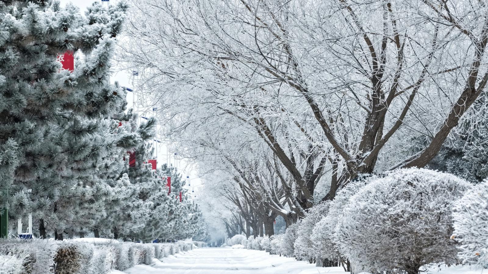 一夜之间,天地仿若被施了魔法,银装素裹,粉妆玉砌。晶莹剔透的雾凇或缀满枝头,或轻盈覆于草木之上,将道路两旁勾勒成了如梦似幻的冰雪世界。凛冽寒风掠过,雾凇凝霜叠雪,既透着北国风光的壮阔苍茫,又藏着一份冬日独有的温柔静谧。