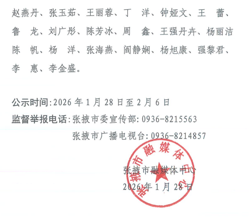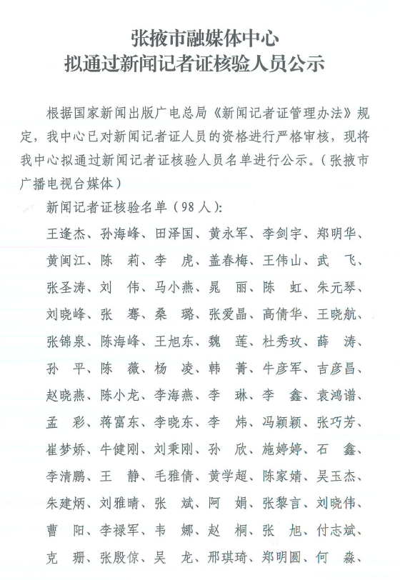 张掖市融媒体中心拟通过新闻记者证核验人员公示
