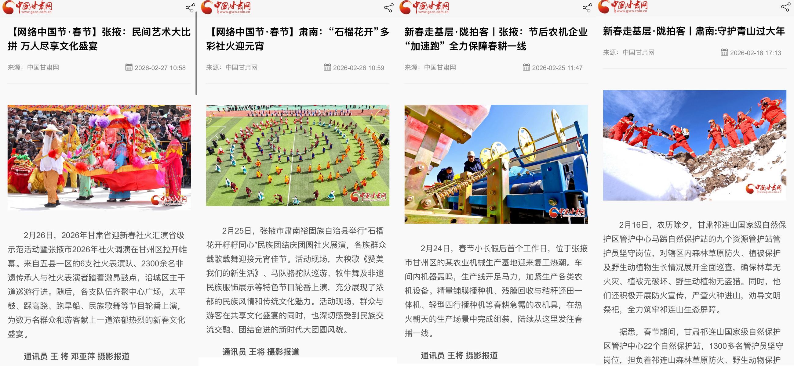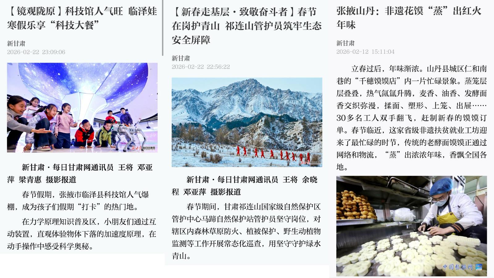 从祁连山脚下的冰雪嘉年华,到古城街区的社火巡游;从夜游张掖的灯光大秀,到非遗工坊里的亲子手作,一幅幅生动鲜活的节日图景在线上线下同步铺展。各类活动的火热开展,也吸引人民日报、新华社、中央广播电视总台、甘肃日报、省广电总台、新甘肃客户端等国家级、省级主流媒体高频聚焦,让“丝路明珠·彩虹张掖”的文旅名片愈发闪耀。(张掖市融媒体中心记者 王钰)