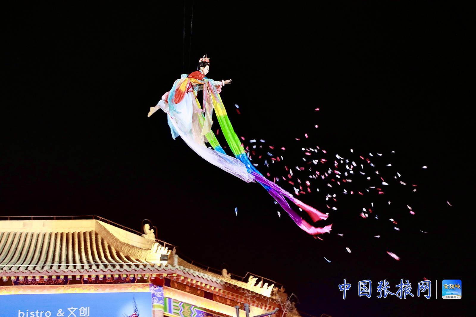 当“天女散花”实景表演惊艳亮相时,整个府城仿佛瞬间坠入仙境——衣袂飘飘的“仙女”凌空而立,花瓣随风飘洒,与古建筑的璀璨灯火交相辉映。市民们纷纷举起手机,定格这唯美瞬间。“太震撼了!仙女散花和府城的夜景简直绝配,希望以后张掖能有更多这样赏心悦目的节目!”市民黄晓婷激动地赞叹道。