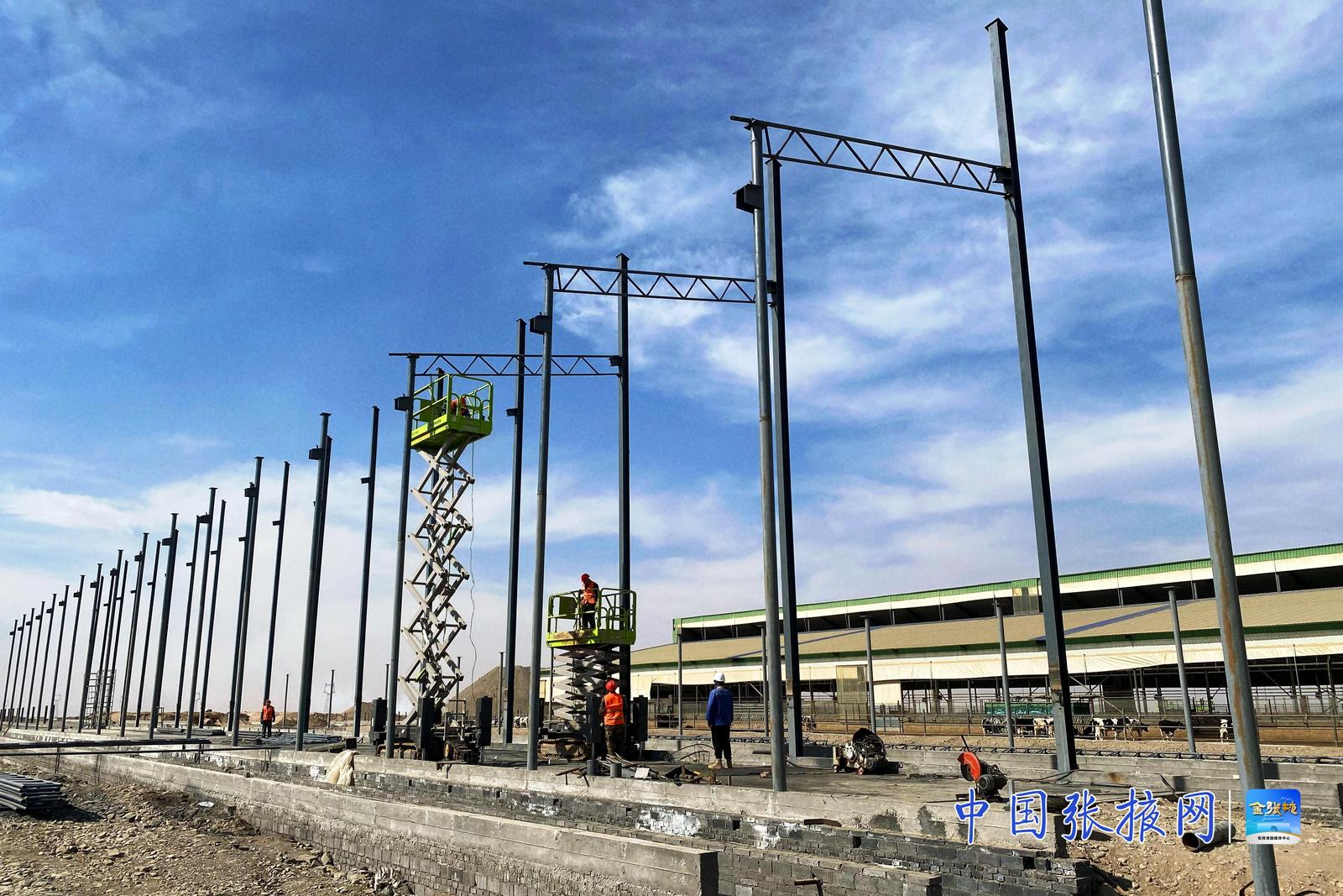 在甘肃华瑞农业股份有限公司低碳智慧奶牛养殖基地项目施工现场,挖掘机、装载机等大型机械来回作业,工人们紧张有序开展立柱搭建、钢筋焊接、场地平整等工作,一派热火朝天的建设景象。