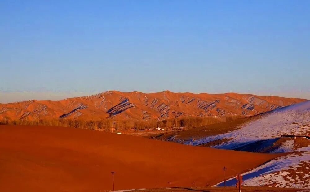 中国张掖网讯 春日的河西走廊,巴丹吉林沙漠西缘,张掖市临泽县板桥镇壕洼村的金沙湾景区迎来最佳观赏期。澄澈蓝天之下,连绵沙丘如鎏金脉络,明暗交织的曲线间点缀着零星残雪,雄浑大漠更添几分清冷诗意。