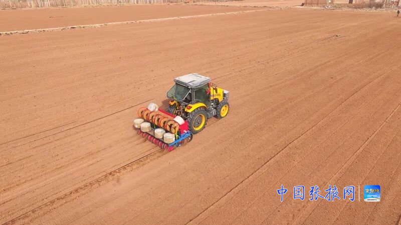 在临泽县平川镇三二村,一台13行机械化播种机正高效作业,播种、施肥、铺设滴灌带同步完成,田垄整齐延伸,效率远超传统人工操作。