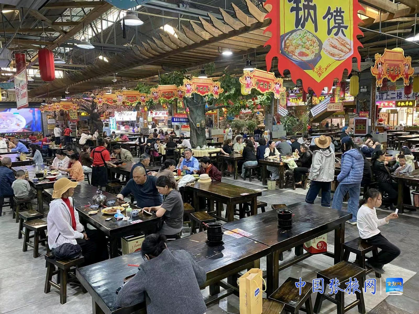 同时,张掖机场深化与春秋航空战略合作,优化航线网络布局,新开通上海=张掖直飞航线,实现张掖到北京大兴、上海、广州、武汉等9个核心城市直飞,构建起“航空+旅游”融合发展“飞圈”。张掖市还推出免停车费、住宿优惠、自驾优待等系列惠客政策,景区与商圈联动发力,城区商场、餐饮街区人潮涌动,住宿、餐饮、零售等行业营收攀升,乡村经济与城区消费同频升温。“清明假期,来张掖旅游的人多起来,我们甘州巷子人流量也大了,150张桌子基本满座,一天的客流量达到5000人左右,大家都是冲着张掖本地特色小吃来的。”甘州巷子经理曹兴明坦言。