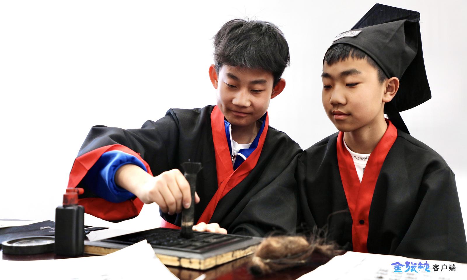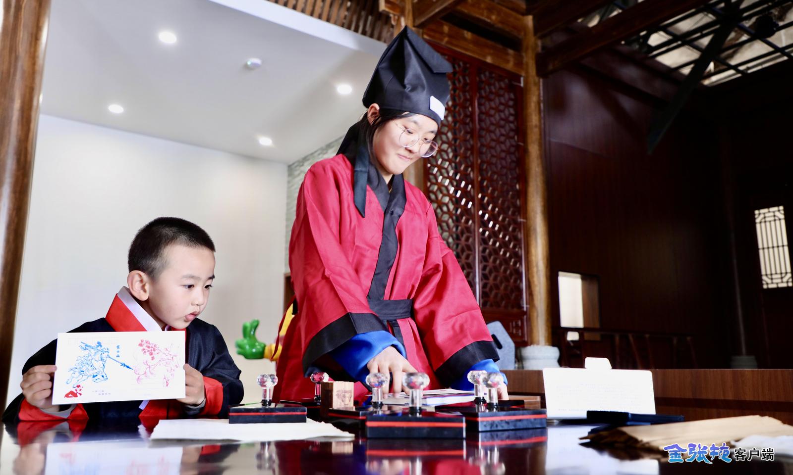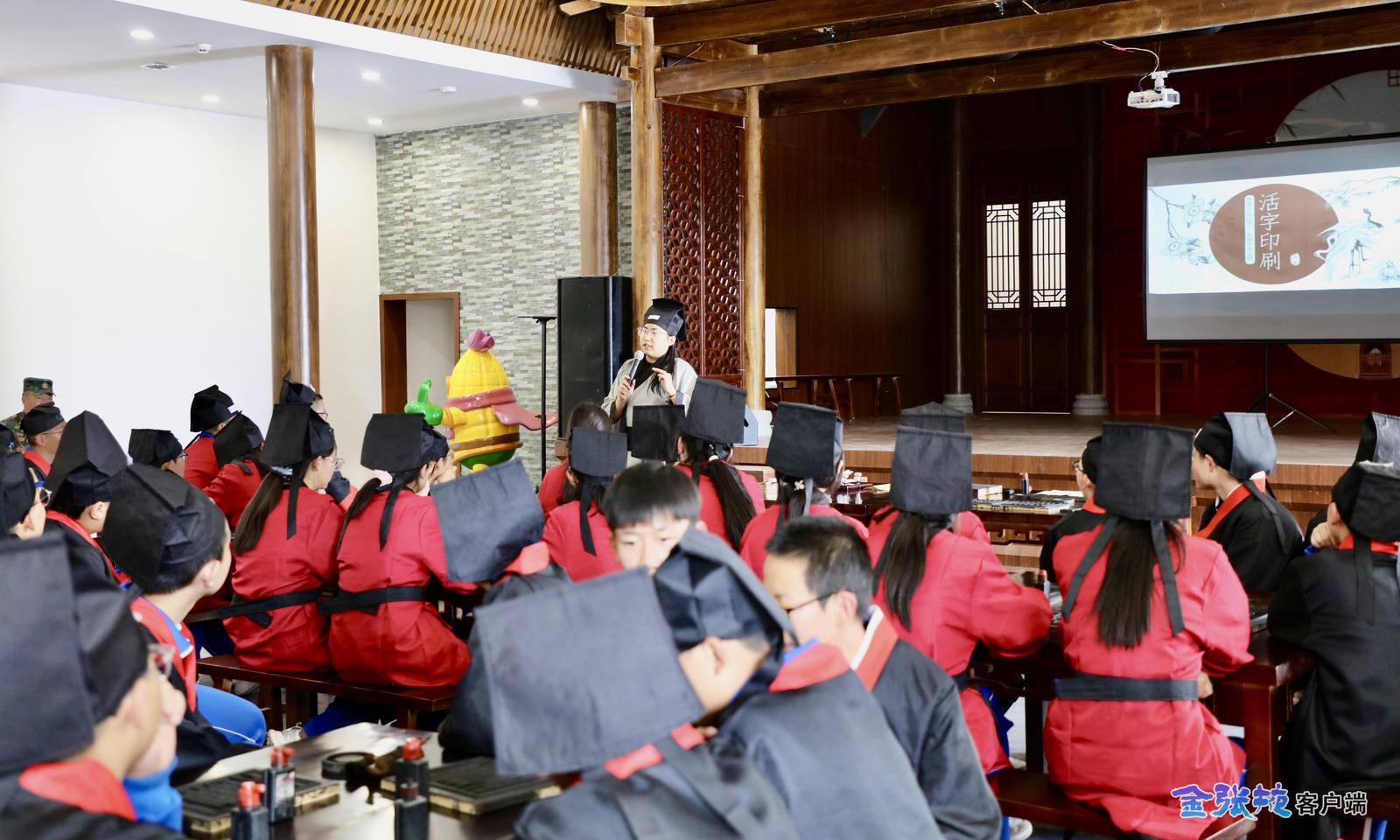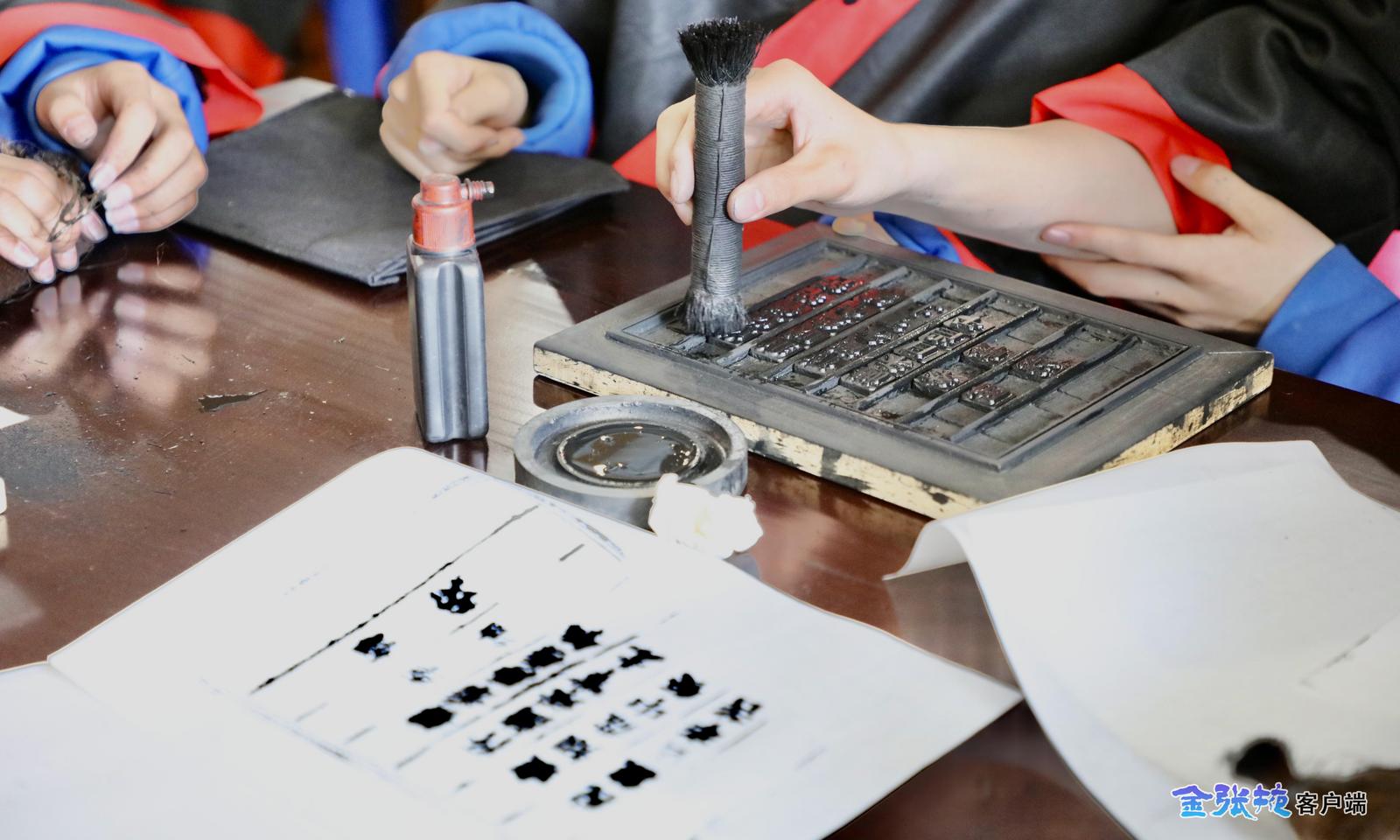 在活字印刷体验课上,老师以“韦编三绝”和“学富五车”两个成语故事开篇,生动讲述了古代书籍笨重且不易保存的局限,随后引导同学们亲手感受活字印刷术这一古老技艺的制作过程。大家认真挑选字模、细心排版,互相合作蘸墨、铺纸、拓印,在一次次按压中近距离接触非遗,在实践中了解汉字的演变与魅力。“通过亲自体验,我感受到了传统技艺的神奇和古人的无尽智慧。在这座古老粮仓里学习传统文化,让历史变得可触可感,也让我更加珍惜和传承中华优秀传统文化。”研学学员张泽坤展示着“新鲜出炉”的作品——印制的《咏鹅》字迹清晰、排布整齐,满脸自豪。