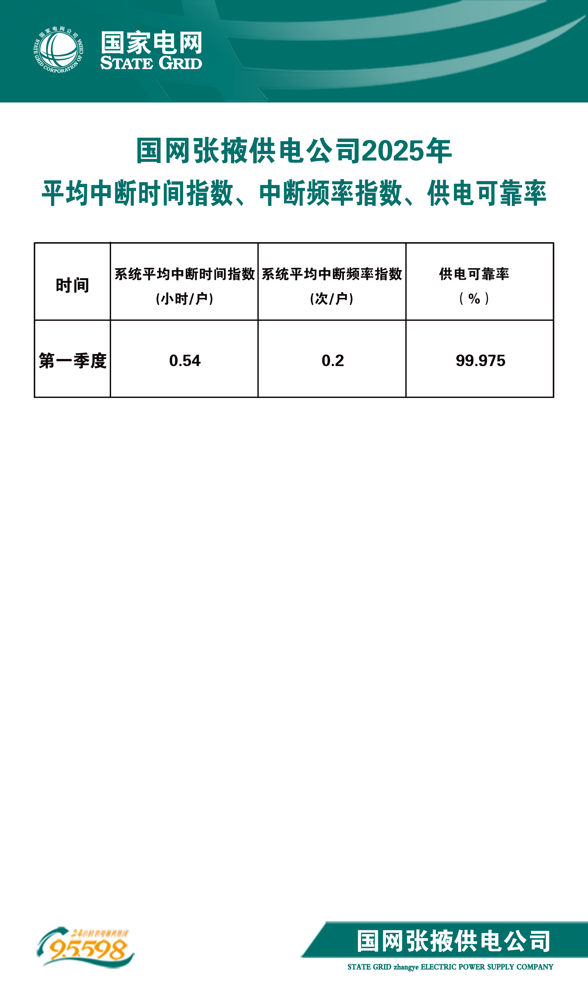 国网张掖供电公司2025年一季度平均中断时间指数、中断频率指数及供电可靠率