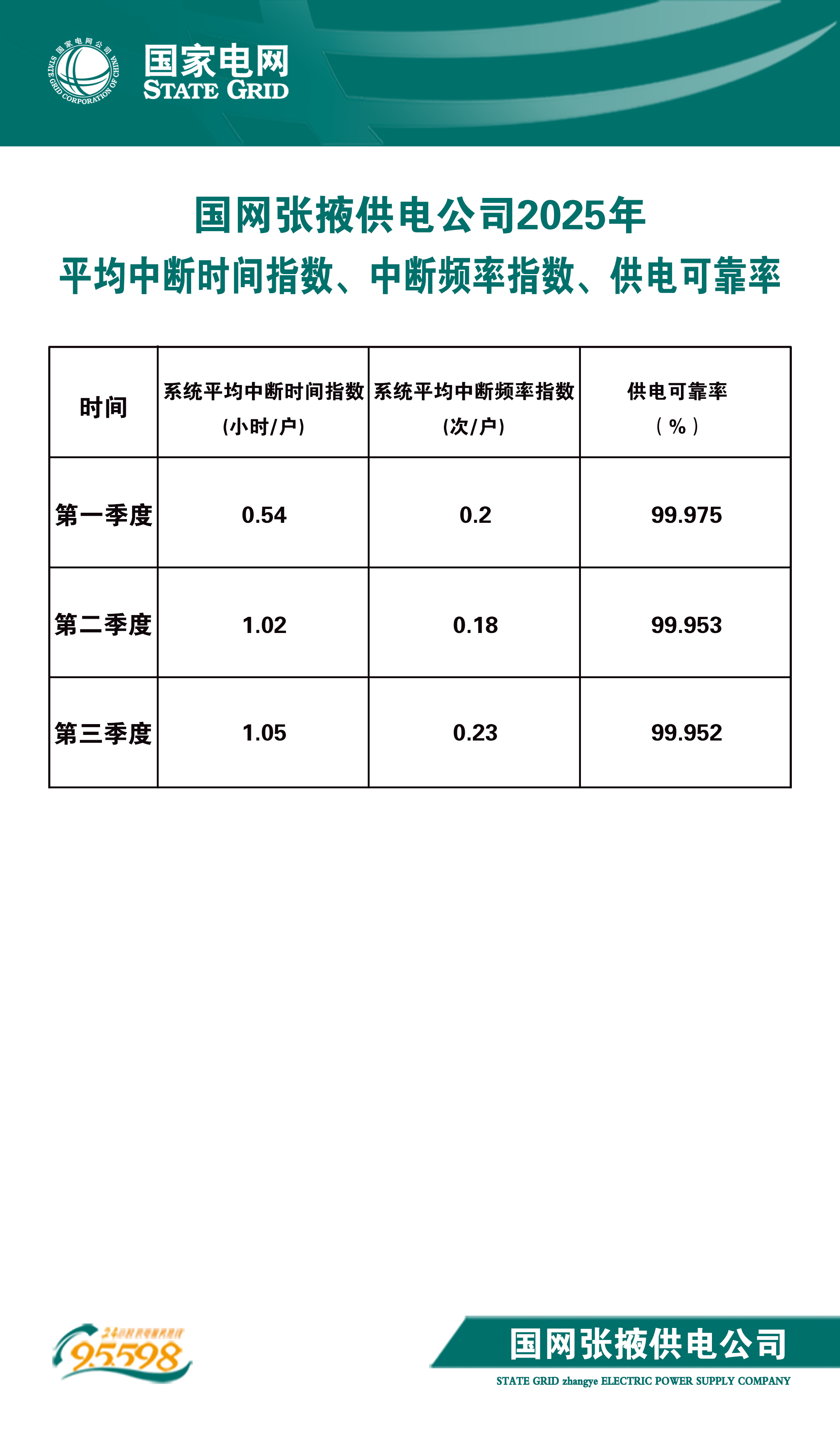 国网张掖供电公司2025年三季度平均中断时间指数、中断频率指数及供电可靠率